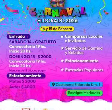 La Municipalidad de Eldorado informa a la comunidad que, a través de la Dirección de Cultura y Educación y con el trabajo articulado de distintas áreas municipales —entre ellas Obras Públicas, Protección Civil y Acción Social— se avanza en la organización de una nueva edición de los Carnavales Eldoradenses 2026, uno de los eventos culturales más esperados del año en la ciudad.