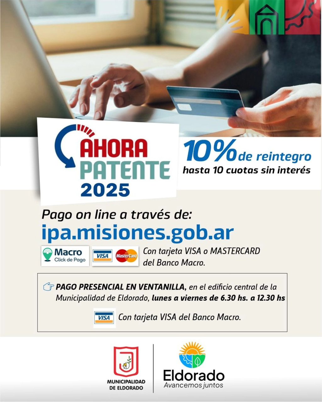 La Dirección de Rentas Generales de la Municipalidad de Eldorado informa que se encuentra vigente desde el 1 de abril y hasta el 31 de diciembre de 2025 el “Programa Ahora Patente 2025”.