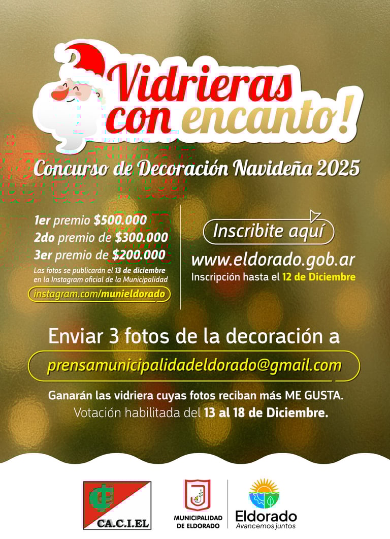 La inscripción estará disponible hasta el 12 de diciembre a través de la página oficial del municipio (www.eldorado.gob.ar), y cada comercio deberá enviar tres fotos de su vidriera decorada al correo prensamunicipalidadeldorado@gmail.com. La votación se habilitará del 13 al 18 de diciembre.
