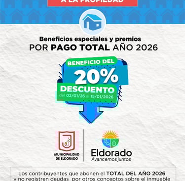 La Municipalidad de Eldorado recuerda que se encuentra disponible la posibilidad de abonar la Tasa Retributiva a la Propiedad 2026, con importantes beneficios para los contribuyentes que elijan el pago total anual.