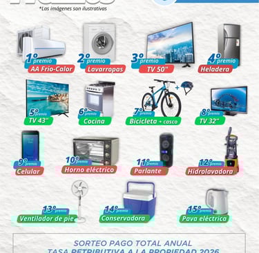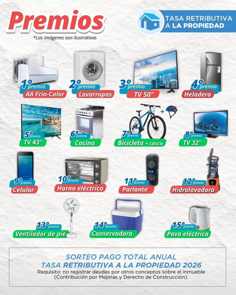 Además, como cada año, quienes cancelen la totalidad de la Tasa 2026 y no posean deudas por otros conceptos vinculados al inmueble (Contribución por Mejoras y Derecho de Construcción), participarán del sorteo de importantes premios.